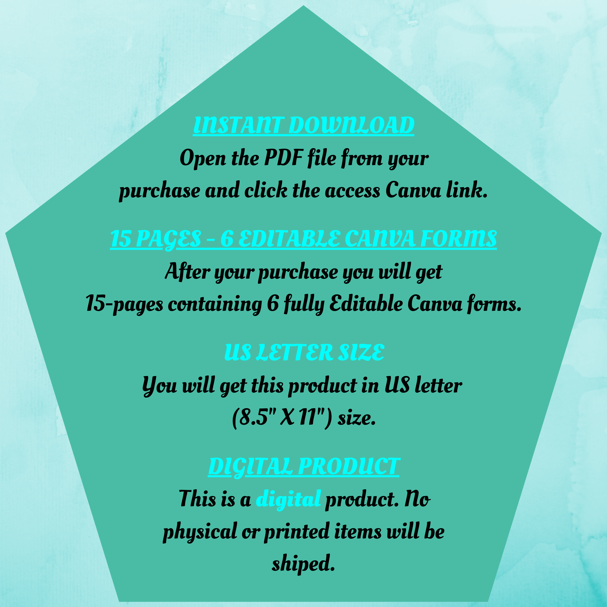 * Q: What if I have trouble using Canva? A: We’ve got you covered! Your purchase includes our “Quick Guide to Canva” that walks you through every step of editing and downloading your new forms.