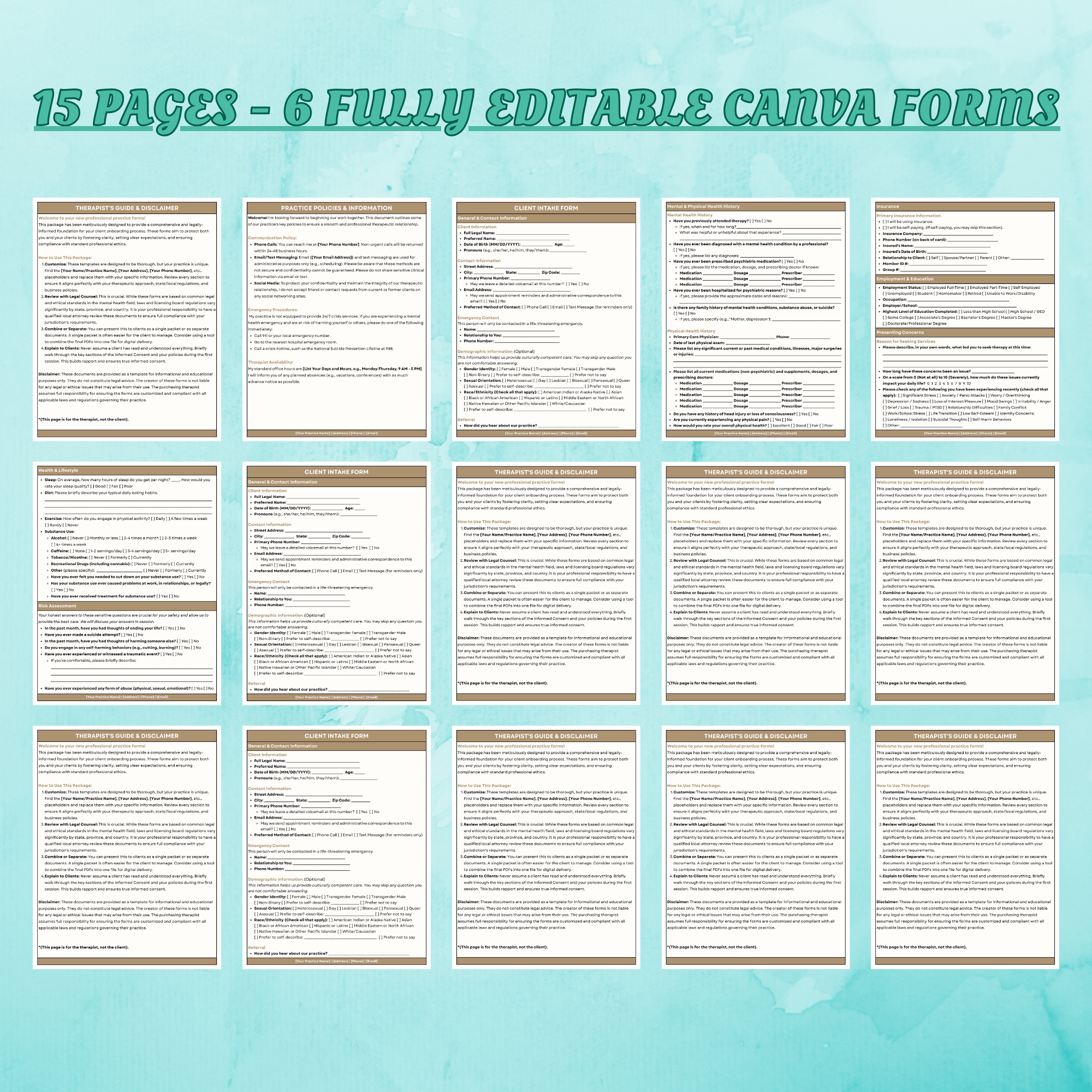 Streamline your client onboarding and elevate your private practice with our comprehensive, professionally designed Counseling Intake and Informed Consent forms. This all-in-one, editable Canva template is the ultimate tool for therapists, counselors, social workers, and psychologists who want to look professional, ensure clarity, and protect their practice from day one.