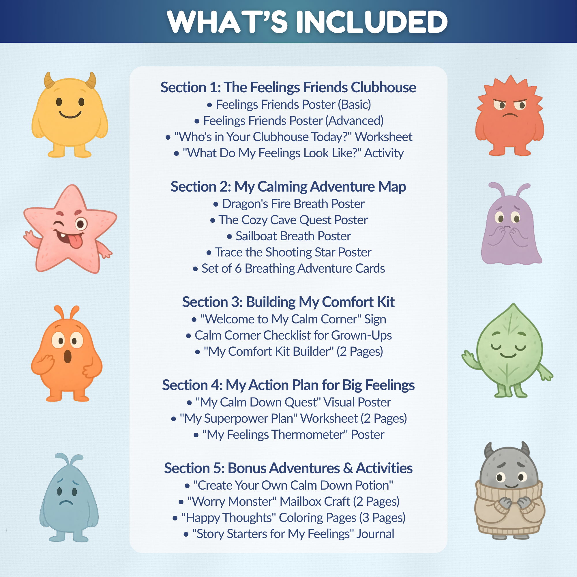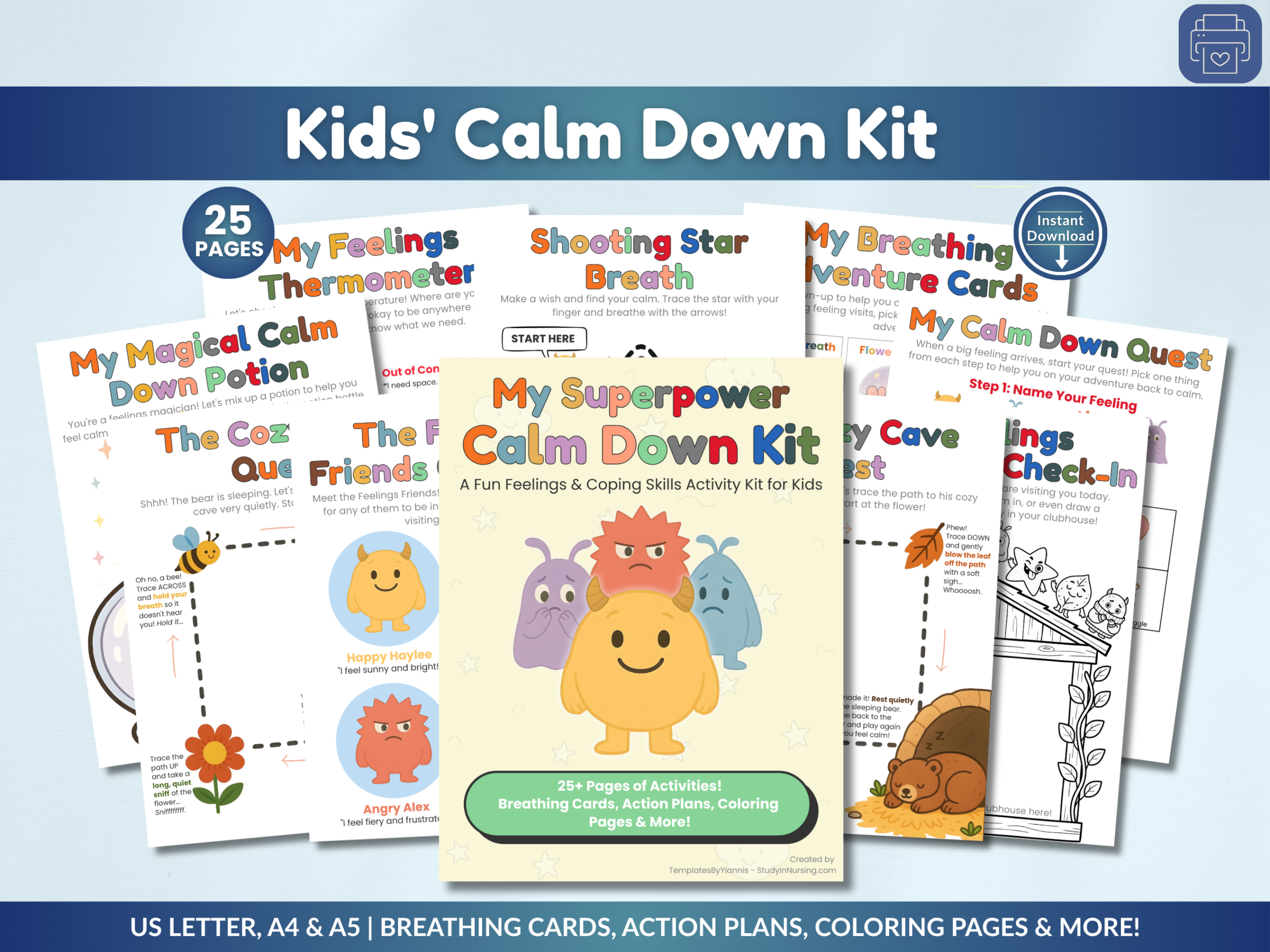 Kids’ Calm Down Toolkit (25+ Pages) in PDF format, available in 3 different sizes (A4, A5, US Letter).