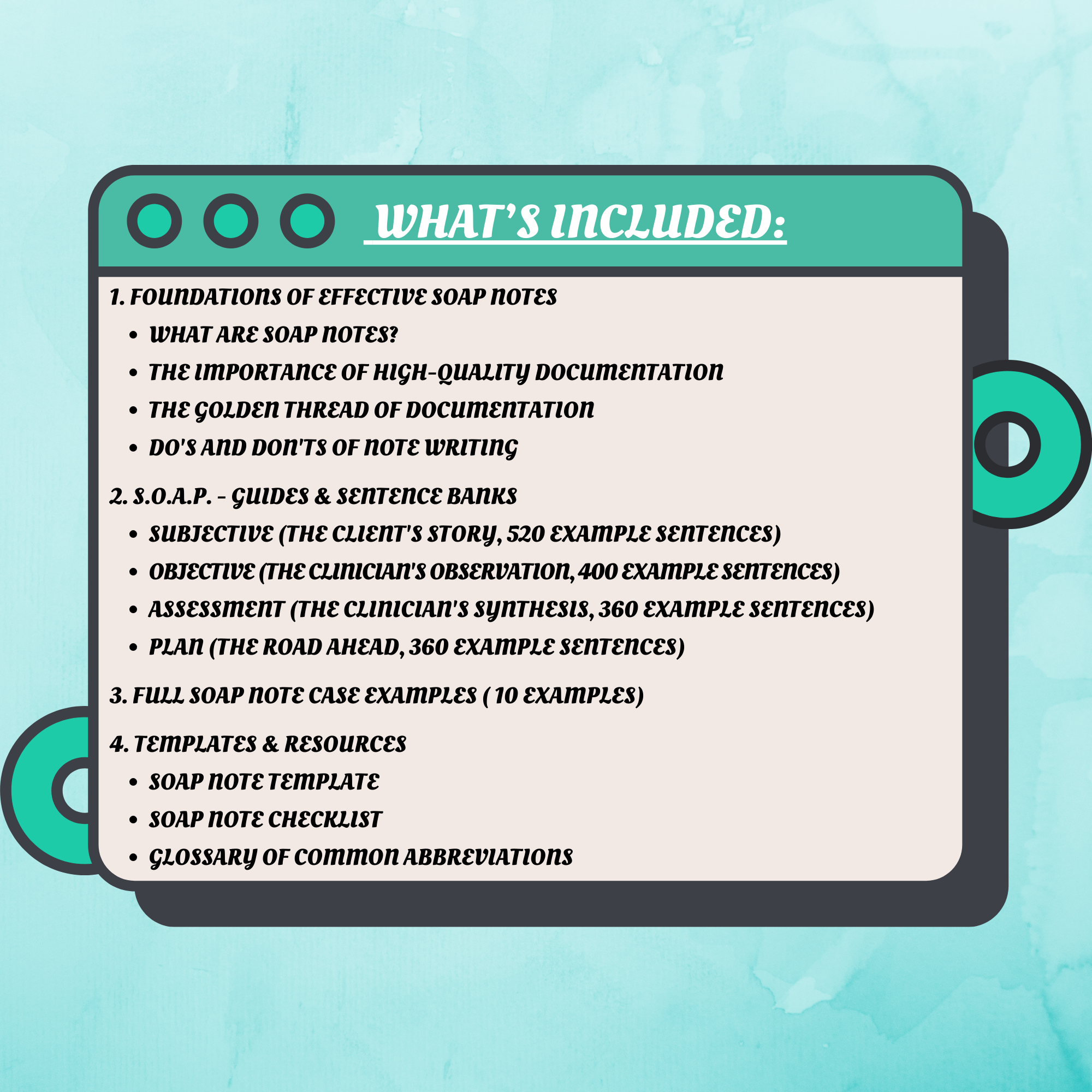 – SOAP Note Checklist: Your final review tool to ensure every clinical note is perfect.