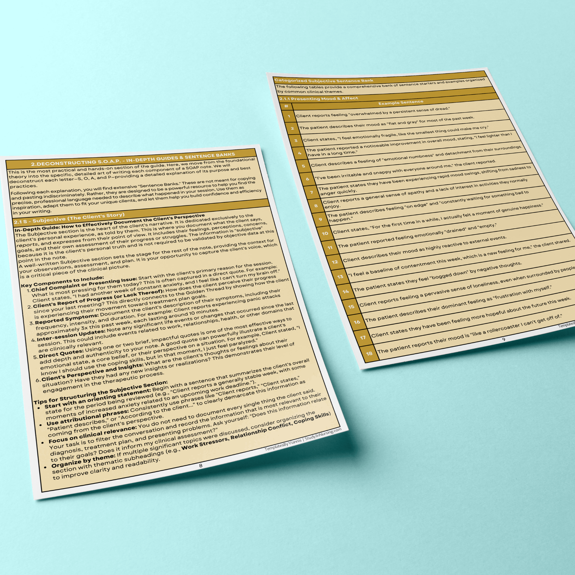 Struggling with therapy notes after a long day of sessions? Master your clinical documentation with The Ultimate SOAP Notes Guide! This all-in-one digital toolkit includes a comprehensive guide, a reusable SOAP Note Template, and over 1,000 sentence examples to make your progress notes faster, easier, and more professional. Stop staring at a blank page and gain confidence in every therapy session note you write.
