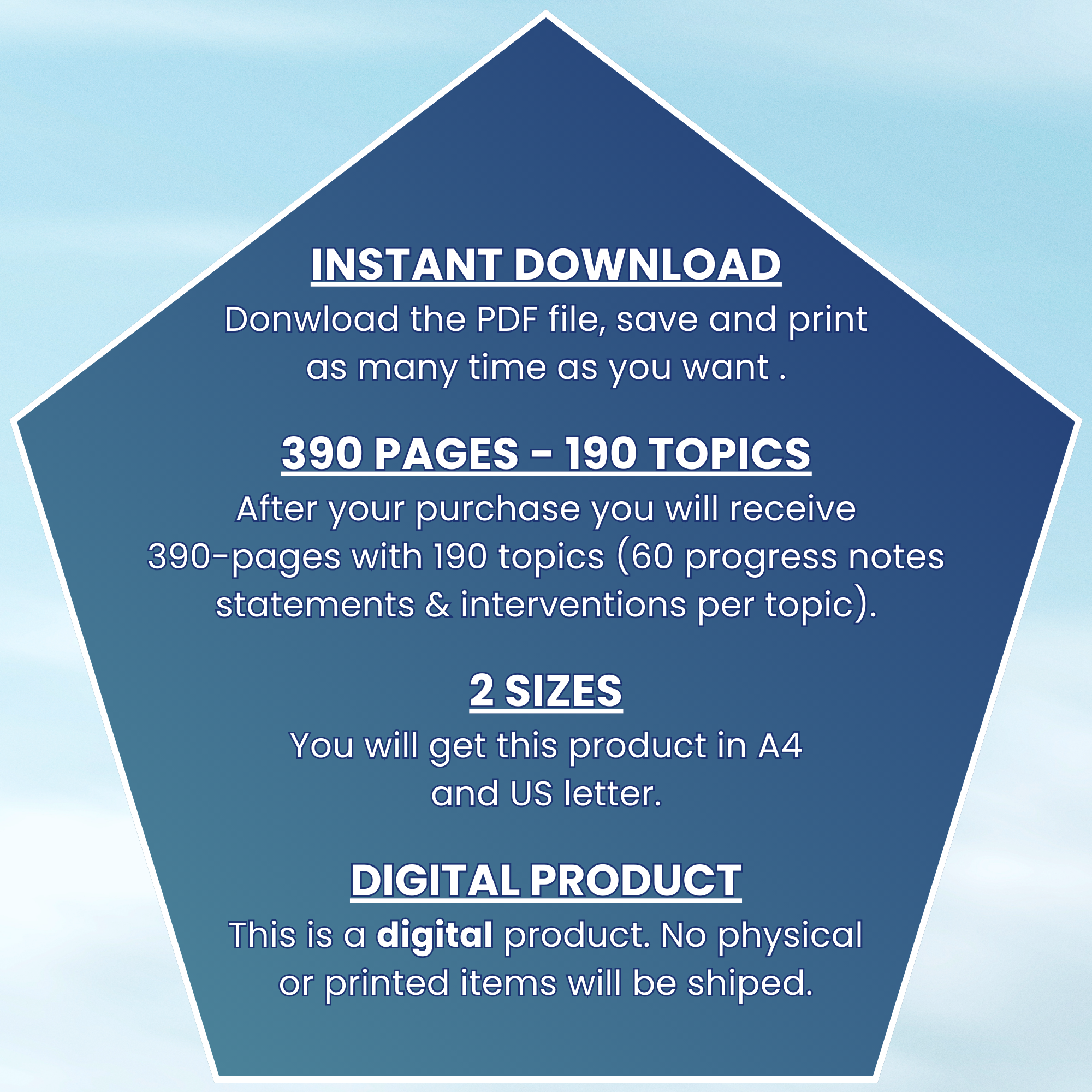 Therapy Progress Note Statements & Therapeutic Interventions Guide (390 Pages) in PDF format, available in two different sizes (A4, US Letter).